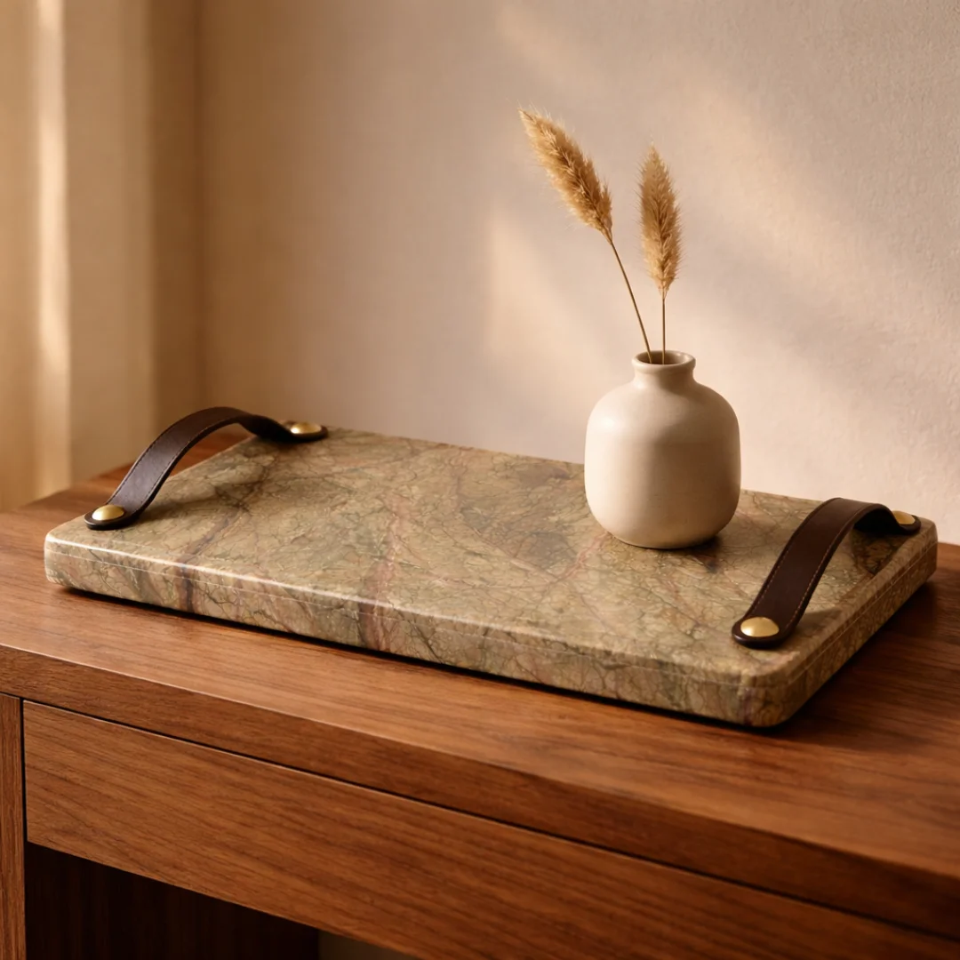 Upgrade your décor with this striking natural marble tray crafted in deep black tones with warm amber veins and a premium gold inlay border. The bold contrast and smooth polished surface make it a statement piece for modern homes. Designed for both style and functionality, this tray is perfect for organizing, serving, or displaying décor accents.